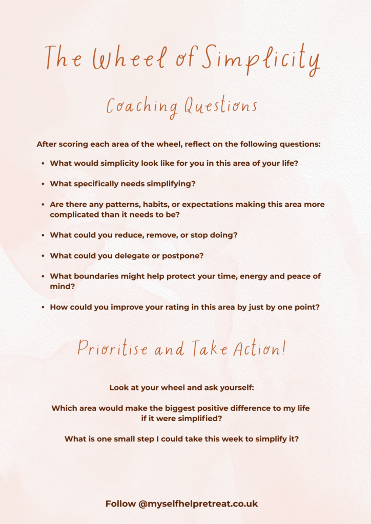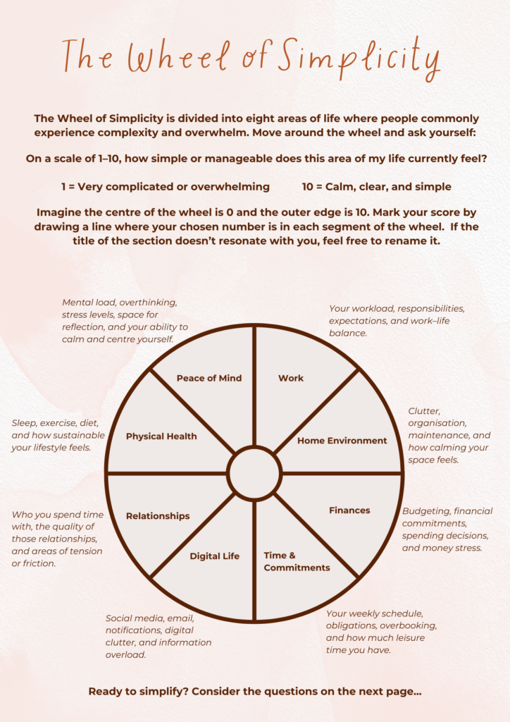 Read on to discover the key insights I took from the book and have a go at simplifying your own life by completing the free coaching tool, The Wheel of Simplicity.